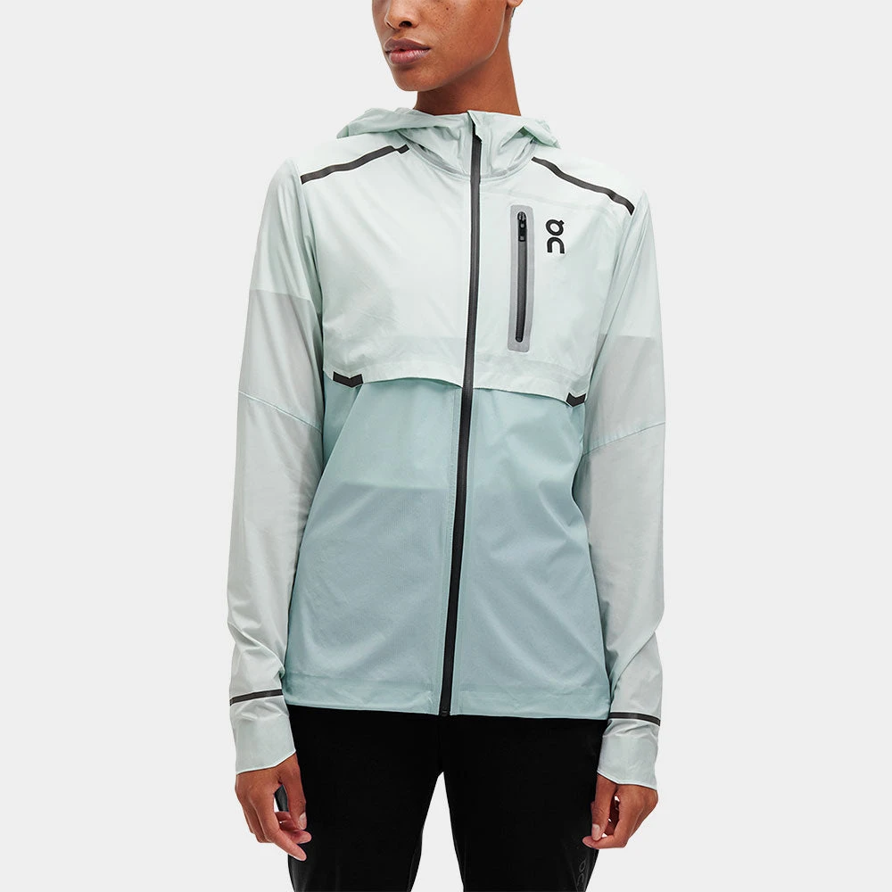 The On Weather Jacket for women provides a lighter than air feel with its 360 degrees of ventilated, 100% Nylon protective material. This technical jacket provides durable, water-repelling coverage and a well-fitted hood that won’t obscure your view while running in unpredictable we ather. It’s also incredibly portable as it can be folded up and stashed w ithin its own water-resistant breast pocket when you don’t need it.